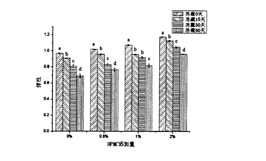 Figure 2.4 The effect of HPMC addition and freezing time on the elasticity of steamed bread………………………………………………………………………………………………………………………………. . 20