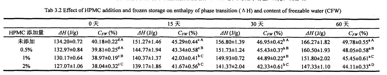 3.3.2 The effect of adding amount of HPMC and freezing storage time on the freezable moisture content (CFW) and thermal stability……………………………………………………………………. 30