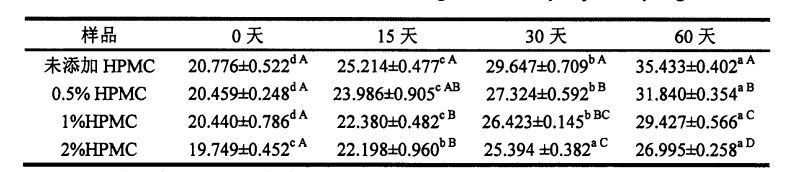 (Frozen storage for 0 days) increased to 1198.09 ± 41.15 CP (frozen storage for 60 days). Correspondingly, the attenuation value of starch suspension without adding HPMC increased from 336.64 ± 71.73 CP (frozen storage for 0 days) to 1027.67 ± 38.72 CP (frozen storage for 60 days); adding 0.5 The attenuation value of starch suspension with %HPMC increased from 303.56±11.22 CP (frozen storage for 0 days) to 833.9±26.45 CP (frozen storage for 60 days); starch suspension with 1% HPMC added The attenuation value of the liquid was increased from 324.19 ± 2.54 CP (freezing for 0 days) to 672.71 ± 10.96 CP (freezing for 60 days); while adding 2% HPMC,the attenuation value of the starch suspension increased from 393.61 ± 45.94 CP (freezing for 0 days) to 557.64 ± 73.77 CP (freezing for 60 days); while the starch suspension without HPMC added The retrogradation value increased from 403.60 ± 6.13 C