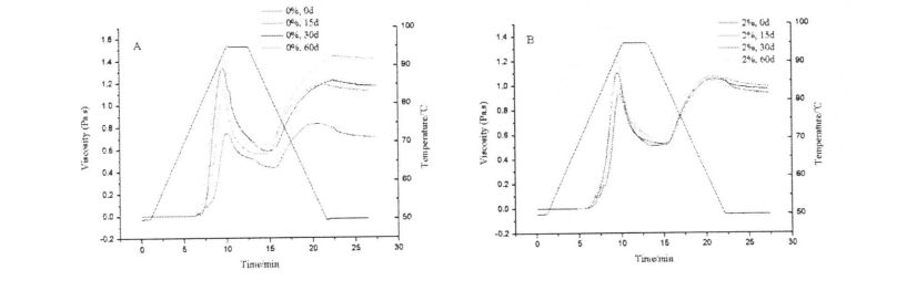The final viscosity of starch suspension without adding HPMC increased from 794.62 ± 12.84 CP (frozen storage for 0 days) to 1413.15 ± 45.59 CP (frozen storage for 60 days). The peak viscosity of starch suspension increased from 882.24 ± 22.40 CP (frozen storage for 0 days) to 1322.86 ± 36.23 CP (frozen storage for 60 days); the peak viscosity of starch suspension added with 1% HPMC The viscosity increased from 846.04 ± 12.66 CP (frozen storage 0 days) to 1291.94 ± 88.57 CP (frozen storage for 60 days); and the gelatinization peak viscosity of starch suspension added with 2% HPMC increased from 91 0.88 ± 34.57 CP