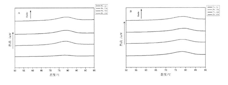 Note: A is the DSC curve of starch without adding HPMC and frozen for 0, 15, 30 and 60 days: B is the DSC curve of starch with 2% HPMC added and frozen for 0, 15, 30 and 60 days